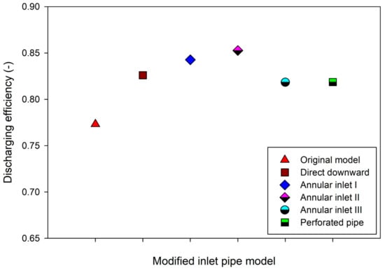 The best temperature stratification of the modified inlet pipe model was the annular inlet II model, which resulted in an enhancement of discharging efficiency of about 8% higher than the original model, as shown in Figure 12. An additional 8% of useful hot water was obtained when the tank included the annular inlet II model. Therefore, the variables having the most effect on temperature stratification were the water outlet sizing, direction, and the number of outlets, respectively.