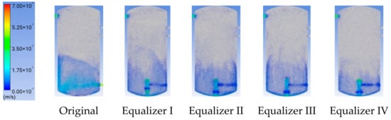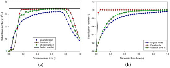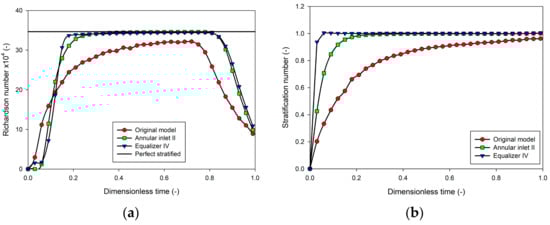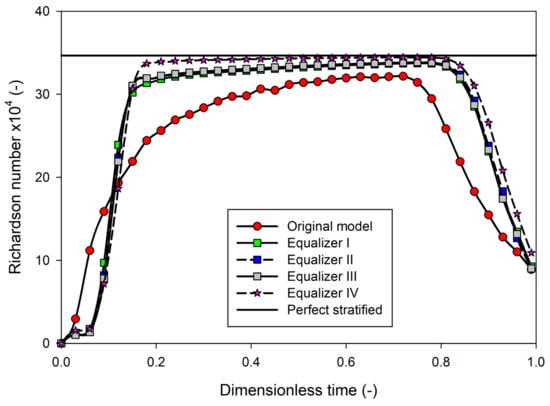 In this section, the auxiliary equipment, such as the equalizer, was implemented to lessen the turbulent mixing and to control the flow direction into the bottom part of the tank. The various equalizer heights and diameters, as represented in Table 1, were implemented in the parametric studies to investigate the best equalizer model. Figure 13 presents the Richardson numbers of the equalizer models, as compared to the original model. It was clearly shown that the equalizer IV model, which had a larger equalizer diameter and a greater number of outlets, provided the highest Richardson number and neared the perfect stratified state. In addition, the variation in equalizer heights did not have a significant effect on the Richardson number, as seen in the equalizer I, II, and III models.
