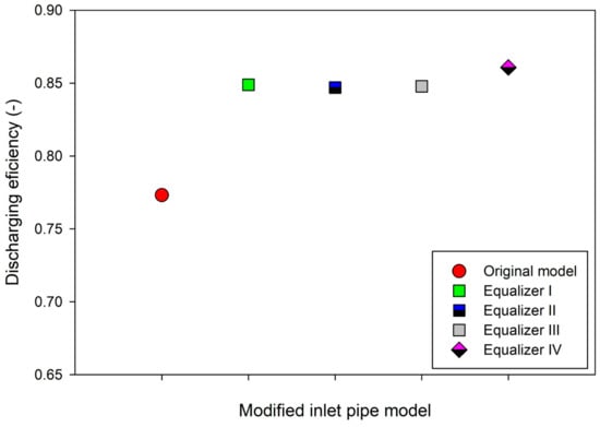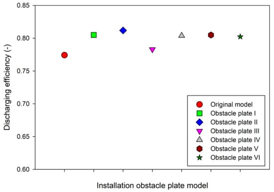 Discharging efficiencies of the equalizer IV and the obstacle plate II models.