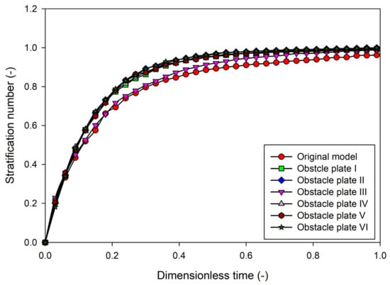 This section shows the results of various modified inlet pipe designs compared to the original storage tank model on temperature stratification. The first results reported the comparative cases of the modified inlet pipe, which had no auxiliary equipment. The Richardson number (), which is the turbulence indicator, and the stratification number (), which identifies the degree of stratified temperature, were used to assess temperature stratification in the thermal storage tank. Figure 8 shows the Richardson number of the direct downward model, annular inlet models, and perforated pipe model, as compared to the original tank model. The results showed that all models of modified inlet pipe improved temperature stratification, as compared to the original model. The model annular inlet II, which had a bigger outlet diameter than annular inlet I, presented a larger Richardson number and reached perfect stratification faster at the dimensionless time 0.3–0.8. As a result, outlet diameter enlargement indicated a higher temperature stratification because it decreased the fluid stream velocity. By changing the outlet direction and including uniform flow distribution and lower flow velocity, the water outlet in the downward direction produced a higher Richardson number and reached the perfect stratification quickly, compared to the annular inlet II and III models. Furthermore, even though the water outlet was uniformly distributed with lower velocity, the annular inlet III model could not reach perfect stratification because of the water outlet’s upward direction, which caused turbulent mixing. The results demonstrated that the downward direction was the best water outlet direction in the discharge period.