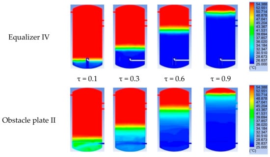For the installation of the obstacle plate, the longer obstacle plate length and the limited amount of water flowing through the perforated plate were the main parameters that decreased the turbulence of water mixing and, consequently, improved the storage tank’s temperature stratification. Mounting the obstacle plate closer to the inlet pipe was an inferior parameter. In this study, the obstacle plate II model, having a longer plate length of 517.5 mm mounted closer to the inlet pipe, could achieve the goal of limiting the recirculation area and providing better thermal stratification. Although the discharging efficiency of this obstacle plate model could increase to 81.5%, however, it was less than that of the equalizer IV model.