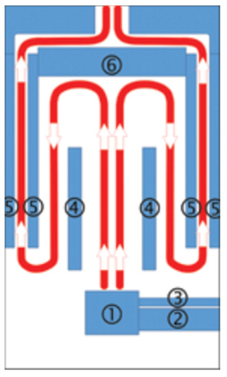 Scheme of combustion chamber construction, with flue gas flow—1: burner, 2: pellet feeder, 3: aeration pipe, 4: partition, 5: water jacket, 6: exhaust deflector.