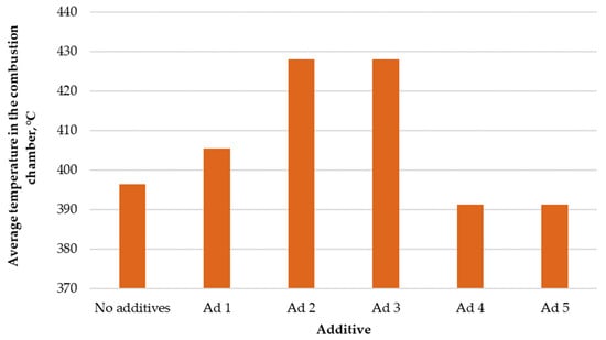 The use of active substances in the thermal conversion process did not result in an increase in temperature in every case. The use of catalyst additives No. 4 and No. 5 caused a slight decrease in temperature in the combustion chamber, by 10 °C on average. The use of other substances increased the temperature by ~10–35 °C. The increase in the average temperature in the combustion chamber may have been due to the improvement in the course of the combustion reaction. This is evidenced by the fact that the catalysts causing the temperature increase in the chamber caused a simultaneous reduction in the amount of CO in the exhaust gas. As a result of the combustion of carbon monoxide, the average temperature increased, and the boiler efficiency increased by reducing the so-called stack loss.