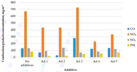 Figure 4 shows the correlation between combustion products’ concentrations in the flue gas and the used catalytic additive type.
