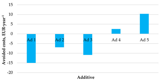 Figure 5 shows the outcomes of the performed economic analysis investigating the effect of the use of catalytic additives on the generation of financial savings.
