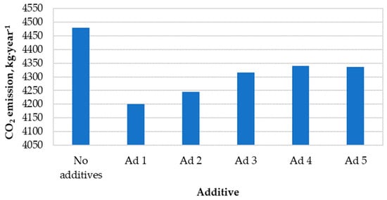 Figure 6 presents the calculated values of annual carbon dioxide emissions to the atmosphere resulting from the combustion of hemp pellets with and without catalytic additives.