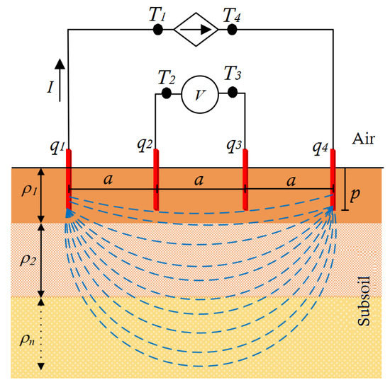 where a represents the distances between two consecutive electrodes, and p is the burial depths of the electrodes, as illustrated in Figure 2. In this figure, , , and are terrometer terminals, and , , and are electrode terminals. The electrical current I is injected through terminals and , and voltage V is measured in terminals and [6].