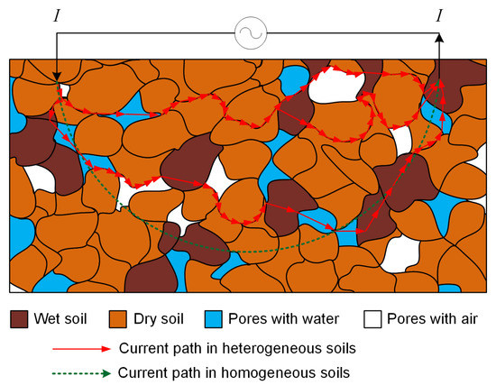 Preferential path of electrical current in homogeneous and heterogeneous soil.