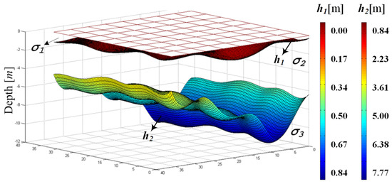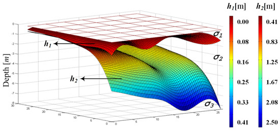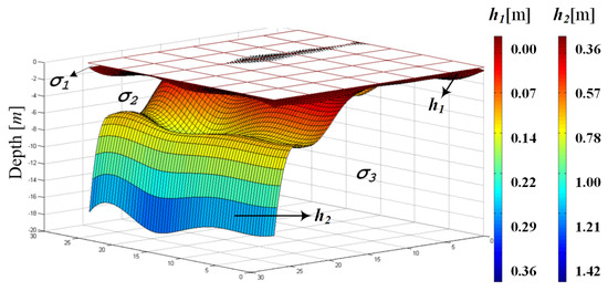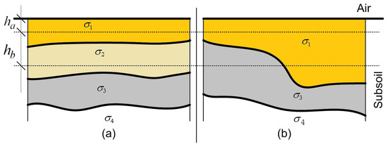 For example, two situations are presented in Figure 4, adapted from Calixto et al. [6], in which (1) would not correctly identify the structure of the soil layers for depth . The usual devices would obtain the same values of apparent electrical conductivity for both Figure 4a,b. These results would be only accurate for depth , whereas the different layers would be neglected for depth . Observe that in Figure 4b the separating surface of the second layer crosses the depth , while in Figure 4a this does not occur. This distinction between the soil layers may only be observed using 3D mapping, using (2) [6].