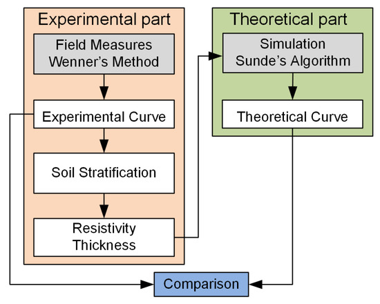 In Figure 5 we first collect the field data using Wenner’s method, as in (2) and Figure 2, to construct an experimental curve [39]. Once the experimental curve is obtained, the soil stratification is calculated and the experimental values for the resistivities and thicknesses of each layer are found. The simulation uses Sunde’s algorithm, which takes the experimental values for the resistivities and the thicknesses of the layers as input. In the simulation, we look for the theoretical curve that is identical to the experimental curve. The theoretical curve is constructed using the values of resistivities and thicknesses of each layer and compared with the experimental curve (Figure 5). If both curves are identical, the values of resistivities and thicknesses represent the stratified soil. Otherwise, if they are not identical, the resistivity values and thicknesses of the layers are modified by the optimization process, seeking to adjust the theoretical curve to experimental one as much as possible.