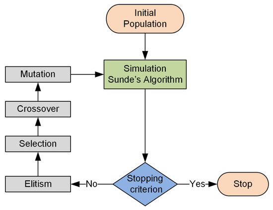 Sunde’s algorithm uses wave propagation equations in already stratified media to construct the theoretical resistivity curve [39]. The resistivity and thickness values are altered within the Sunde’s algorithm by using a heuristic method for optimization based on genetic algorithms. This method searches for the best solution for the stratification process and the parameters, optimized using genetic algorithm. The values optimized are: (i) the resistivity of each layer , (ii) the thickness of each layer and (iii) the number of layers N. Figure 6, adapted from Calixto et al. [7,39], shows a flowchart of the genetic algorithm.