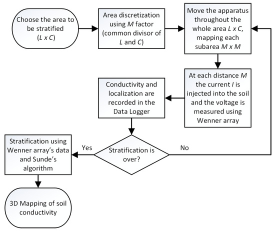 The stored data are: (i) location (latitude, longitude, and altitude) and (ii) values of the potential differences of the four measurements. If the configuration of Figure 10 is used, we have values of the potential difference for each . After performing the readings throughout the soil, the stored data are placed on the computer for processing. After the treatment of data, the stratification and the 3D mapping of the soil are generated. Figure 12 illustrates the whole flow of methodology for using the proposed device.