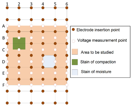 Figure 1, adapted from Silva Filho et al. [32], illustrates the lateral profiling method of soil investigation, in which the measurement process of apparent electrical resistivity is performed for the measuring spots given by the intersection between the Column 1 and the Row A, Row B, Row C and Row D. The Wenner’s method is applied in Figure 1, where the current and voltage electrodes are represented by dots in the blue color while the dots in the red color are the measuring spots of . By performing the lateral profiling method along Column 1, Column 2, Column 3 and Column 4, the mapping of the apparent electrical resistivity over the surface of the soil being studied is obtained [33,34].