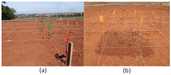 In the area limited by ropes, a quadrant was chosen to insert approximately eight liters of water to change the dynamics of the system. Figure 14a shows the connectors/rods with the cables, where the red arrows indicate the electrical current cables and the green arrows indicate the voltage cables. In Figure 14b, it may be observed the spot where the portion of water in the soil was spilled.