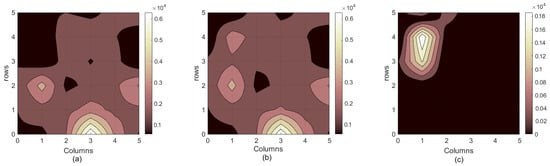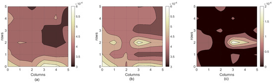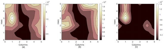 To evaluate the method, the electrical resistance measurement is performed in the study area before and after the insertion of the water portion. Table 1 provides the values of the electrical resistance measured using the terrometer, where and are the electrical resistances before and after insertion of the water portion, respectively. These electrical resistance values were measured along Line A through Line F and along Column 1 through Column 6.