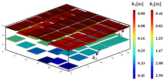In the Section 4.2, 3D mappings are performed. In addition to the visualization form presented in Figure 20, Figure 22 and Figure 24, there are other forms of visualizing the 3D mapping, such as the mapping of the separating surfaces between layers, using the values of without any interpolation, i.e., representing the stratification performed on each subarea. Figure 25 presents this kind of visualization for the mapping of the profile of the Leptosol, with the colorbar representing the depth of the separation surface between the layers of each subarea with the thicknesses and .