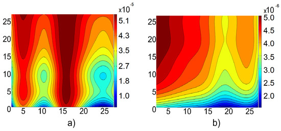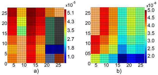 Visualization of a subarea’s conductivities in Leptosol’s profile. (a) First layer and (b) second layer.