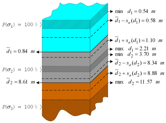 Considering that the thickness values of the layers correspond to the normal Gaussian distribution, the data presented in the Table 11 and in Figure 28 may be described in the form of the Table 12, presenting the probability of finding given layer i at depth d. For instance, at a depth of () the probability of still being in the first layer is only , and to already be in the second layer is .