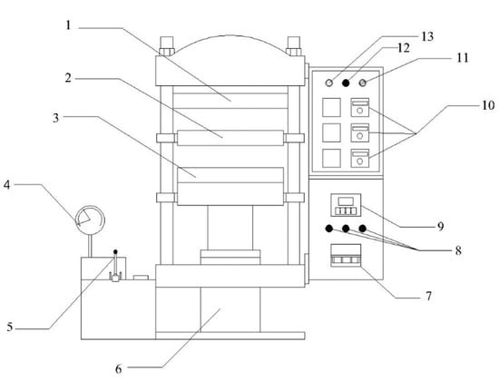 Schematic diagram of the hot-pressing experimental equipment: 1-Upper-layer hot plate; 2-Middle-layer hot plate; 3-Lower-layer hot plate; 4-Pressure setting and display instrument; 5-Pressure relief handle; 6-Hydraulic cylinder; 7-Main switch; 8-Indicator light; 9-Timer; 10-Temperature setting meter for each layer; 11-Heating switch; 12- Indicator light; 13-Pressure switch.