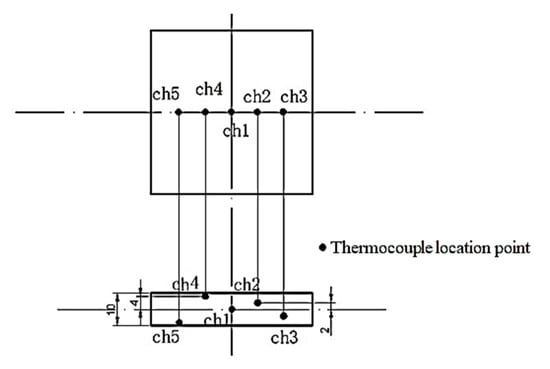 The hot-press drying experiments were carried out in hot-pressing equipment shown in Figure 1. The hot-presser (XLB-D 400 × 400 × 2/0.50 MN, Qingdao Xincheng Yiming Rubber Machinery Co., Ltd., Qingdao, China) has two layers, which can press two paperboards simultaneously. The upper paperboard was put between the upper-layer and middle-layer hot plate used to measure the weight and dimension change in the drying process at a regular interval of 5 min. The measurements were used an electronic balance (Shanghai Liangping Instrument Co., Ltd., Shanghai, China) with an accuracy of 0.01 g and a vernier caliper with an accuracy of 0.1 mm. Each sampling process of weight and dimension measurement lasted about 1 min. Meanwhile, the lower paperboard was put between the middle-layer and the lower-layer hot plate used for monitoring the internal temperature online using the multi-channel temperature tester (AT4610, Changzhou Anbai Instrument Co., Ltd., Changzhou, China). Five T-type thermocouples were arranged within the lower paperboard in series along the thickness direction of the sample. The distribution of thermocouples is shown in Figure 2. In order to ensure the accuracy of temperature measurement, five thermocouples should be in the center of the insulated paperboard and distributed symmetrically in the horizontal direction. The average temperature of the five measuring points was taken as the final measured temperature.