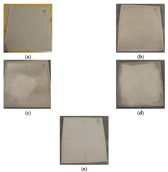 As the transport of moisture from the paperboard, the morphological changes of the insulated paperboard can be seen from figures. Figure 3a is the raw state of the insulated paperboard that has uniform moisture distribution as represented with the same color across the entire surface. After being cold-pressed with the mechanical press, which we called the initial state, as shown in Figure 3b, the surface of the wet paperboard becomes smoother than the raw state. The dimensions of the length, width, and thickness of the paperboard are all changed in the cold-pressing process. Both length and width became large slightly while the thickness decreased clearly. Meanwhile, the pressure drives the internal moisture to migrate within the insulated paperboard, causing the surface to present different colors. Compared to the location close to the edges, the color in the center is a little lighter, which means that moisture diffuses outward from the center to the edges. Then, for hot-pressing, Figure 3c,d give the appearance of the insulated paperboard after 5 and 10 min of the hot-pressing process, respectively. We can see the moisture distribution on the surface of the insulated paperboard has changed distinctly as the color indicated in these figures. The darker the color presented on the board means higher moisture content. From Figure 3c,d, we see that the light color area gradually expands from the center to the edges, or the dark color areas shrink as the drying time is processed. This is attributed to accelerated moisture mitigation within the paperboard under the combined effect of temperature and pressure. When the internal moisture of the wet paperboard is removed, the internal fibers are tightly crossed with fewer pores that filled with water earlier. After the hot-pressing process is finished, as Figure 3e shows, there was no longer any obvious moisture distribution; namely, the color across the surface will look no different anymore. Compared with other dimensions, the thickness of the paperboard changes greatly, from the raw 10 mm to the final 2 mm.