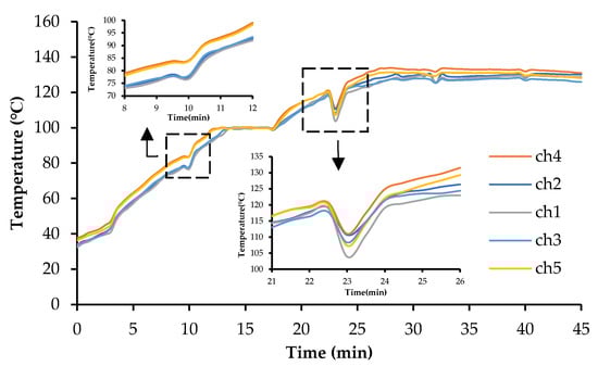 The variation of temperature with time at different layers under 130 °C is presented in Figure 4. All the operations during the drying process can be reflected by the temperature curve. For instance, the evident fluctuations of temperature represent the sampling operation in the drying process. The temperature was sharply decreased in a short time with the opening of hot plates. When the hot plates closed, the heat was absorbed by the surface of the sample and transferred simultaneously to the center layer by conduction. Therefore, the distribution of temperature between different layers was clearly different. Along with the thickness, the temperature decreased from the surface to the center.