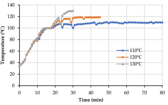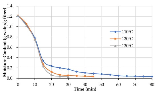 Under the same other conditions, more heat can be transferred within the wet insulated paperboard for promoting water removal when a higher temperature is employed. As presented in Figure 5, the time for the warm-up stage is shortened slightly when the operating temperature raised to 130 °C from 110 °C. Moreover, there was almost no difference in moisture behavior at different operating temperatures for the first stage from Figure 6 and Figure 7, especially during 0~10 min. However, the higher temperatures clearly rendered the slopes steeper on the third stage, as shown in Figure 5. We can also see the same phenomenon from Figure 6 and Figure 7. It indicated that high temperature mainly affects the medium and later stages (after 10 min) in the drying process. Raising the operating temperature could contribute to improving the drying rate and reduce the drying time consequently. In order to reduce energy consumption, the lower temperature (e.g., 100 °C) should be applied in the early stage (0~10 min) to preheat the samples. When the samples’ temperature approached boiling point (100 °C), a higher temperature (e.g., 130 °C) is supposed to be employed to improve the moisture transfer rate. It is recommended to operate under different stages for the whole drying process while not keeping the same temperature constantly. The larger drying rate will be obtained for the higher temperature, and its maximum value was increased from 15.34 to 17.80 g/min, i.e., enhanced by 16.04% when the operating temperature increased from 110 to 130 °C. The drying times were 30, 45, and 80 min at 130, 120, and 110 °C, respectively.