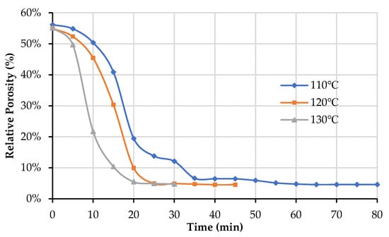 It can also be seen from Figure 8 and Figure 9 that when the operating temperature is 110 °C, the insulated paperboard size retention rate after drying is 44.92%, and the relative porosity is 4.57%; when the operating temperature is 120 °C, the final size retention rate is 45.20%, and the final relative porosity is 4.53%; when the operating temperature is 130 °C, the final size retention rate is 43.91%, and the final relative porosity is 4.75%. It is concluded that the higher temperature could contribute to relative porosity and the size retention rate decreases, shortening the drying time by 62.50% (from 80 to 30 min) when the operating temperature increased from 110 °C to 130 °C.