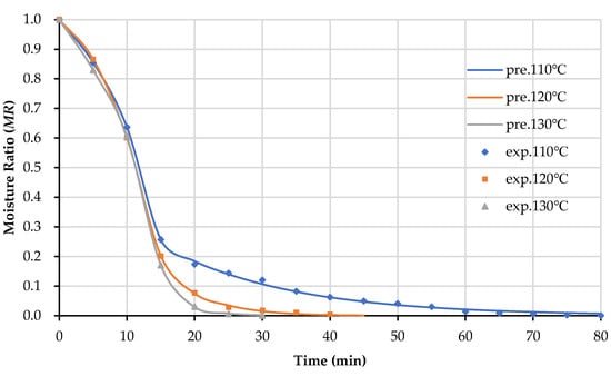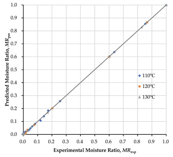 In all operating temperatures, the R2, χ2, and RMSE values of the evaluated mathematical models were in the range of 0.89347–0.99999, 0.00001–0.02067, and 0.00120–0.12863, respectively. Among the tested models, the new model proposed by this study correlated best with experimentally detected moisture ratio drying curves as its R2 (0.99961–0.99999) was the highest while its χ2 (0.00001–0.00005) and RMSE (0.00120–0.00599) values were the lowest. It indicated that the new model was the best-fitted model to describe the drying behavior of the insulated paperboard. Figure 10 shows the excellent agreement between experimental and predicted MR values at different operating temperatures as the data points mainly scatter near the 45° straight line.