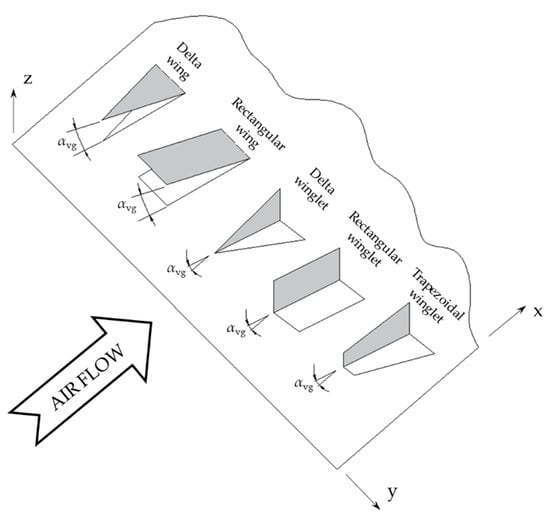 The conventional shapes of VGs are usually in forms of delta wing, rectangular wing, delta winglet, rectangular winglet, and trapezoidal winglet (Figure 1). Wing configurations are connected to the fin surface with their trailing edges, and winglet configurations are connected with their chords. Fiebig [4] studied the performance of delta wing and winglet-type VGs for the purpose of heat transfer enhancement and reduction of flow friction. He found that the surface with delta-winglet type VGs was superior to the surface with delta-wings in terms of heat transfer performance.
