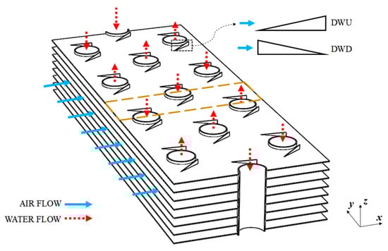 Distributions of the local air−side heat transfer coefficients on the plain fin surface and upper fin surface without mounted vortex generators for air−to−water FTHEXs with DWD and DWU configurations. Test conditions: Tair,in = 22 °C, Twater,in = 40 °C, wair,in = 1.03 m/s, wwater,in = 0.76 m/s.