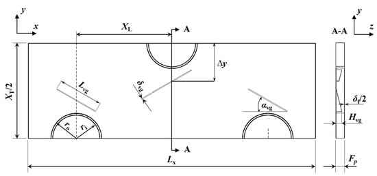 The main dimensions of FTHEX, annotated on Figure 3 are as follows: XT = 60 mm, XL = 30 mm, Lx = 90 mm, Fp = 2.81 mm, δf = 0.2 mm, di = 14.8 mm, do = 15.9 mm. Winglet height equals 0.65 Fp (Hvg = 1.827 mm) and chord length of each winglet is 0.9 do (Lvg = 14.31 mm). The central distances between the tube and the winglet in the airflow direction and in the spanwise direction are ∆x = 0 mm and ∆y = 13 mm, respectively. In order to analyse the influence of attack angle, three attack angles (αvg) 15°, 30°, 45° were considered. A schematic view of the computational domain is presented in Figure 4.