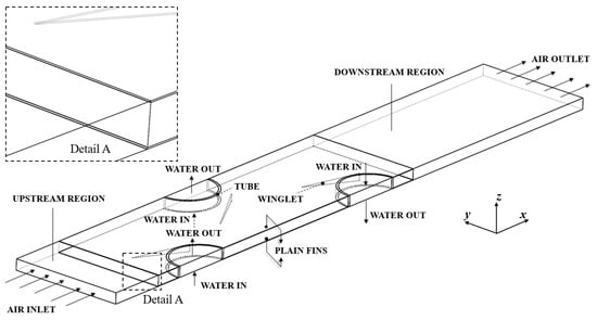 Computational domain of air-to-water fin-and-tube heat exchanger with delta-winglet type vortex generators.