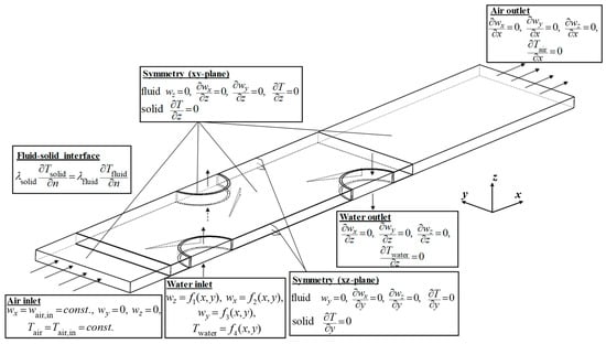 Boundary conditions are applied at the domain’s outer boundaries and at the physical boundaries between the subdomains. The velocity and temperature profiles at the air inlet are uniform. On the contrary, in long tube circuits employed in air-to-water FTHEXs with multiple water passes, water flow is often considered as fully developed, because the entrance length is relatively short compared to the length of the water circuits. Therefore, the assumption of uniform profiles at the water inlets may be insufficient in numerical simulations. Thus, fully developed temperature and velocity profiles are set as boundary conditions at the water inlets. The outlet boundary condition, described by a fully developed fluid flow without variation of variables in the flow direction, is defined at the air and water outlets. At the front and back, as well as at the top and bottom boundary surfaces, symmetry boundary conditions have been applied. Heat transfer in the boundary layer near the wall region is used to describe heat transfer at the fluid-solid interfaces. At the fluid-solid boundaries, velocity of the fluid equals that of the solid boundary, i.e., zero, due to viscous effects. A schematic representation of the boundary conditions for FTHEX with vortex generators is given in Figure 5.