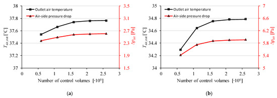The mesh independence test was carried out for the case of the FTHEX with DWD configuration and the attack angle αvg = 30° with five different sizes of the mesh: 0.6 million, 1.12 million, 1.61 million, 2.11 million and 2.59 million cells. Computed values of air outlet temperatures and air-side pressure drops for selected test conditions are shown in Figure 7, showing no significant difference in results after the third mesh refinement. To achieve reasonable accuracy with shorter computation time, all simulations were performed with the mesh size of 1.61 million cells. Mesh generation and the independence test were performed using the same approach for the air-to-water FTHEX with plain fins, and a similarly sized mesh has been adopted.