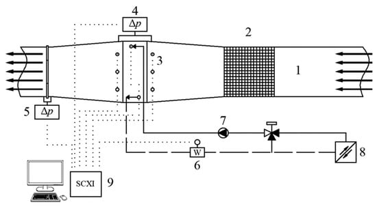 The experimental line: (1) air ducts, (2) flow straightener, (3) heat exchanger test section, (4,5) differential pressure sensors, (6) water mass flow meter, (7) water circulating pump, (8) heating source, (9) data acquisition.