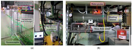 Air inlet and outlet temperatures were measured with thermocouple arrays placed upstream and downstream of the FTHEX, consisting of five and fifteen K type thermocouples, respectively. Water temperatures at the heat exchanger inlet and outlet headers were measured using four Class “A” platinum resistance thermometers, two at the inlet and two at the outlet. All the measurement signals are collected and converted by the National Instruments SCXI data acquisition system, where measurement data was stored every 1 s through LabView software [41], installed on a personal computer. The FTHEX test section and closed water loop are shown in Figure 9.