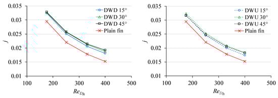 In order to investigate the effects of the attack angle on the air-side thermal and hydraulic performances of FTHEX with delta-winglets, three different angle values were considered: 15°, 30°, and 45°. The air-side heat transfer characteristics are presented in terms of the dimensionless convective heat transfer factor, i.e., the Colburn j factor: