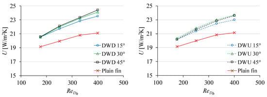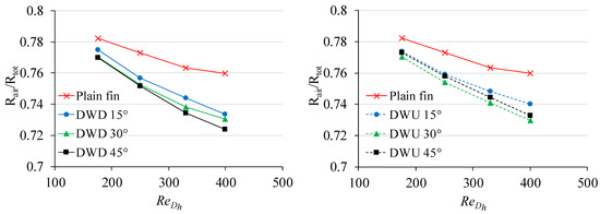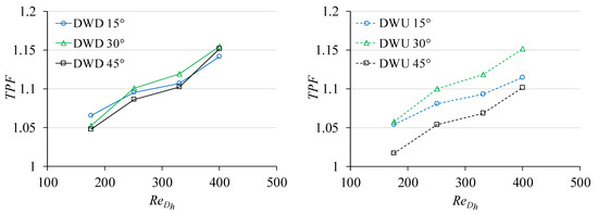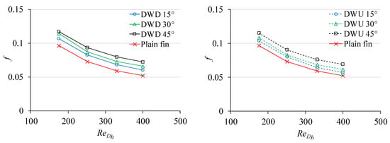 The increase in heat transfer is often accompanied by an additional pressure drop. Figure 12 shows the relations between the friction factor f and the Reynolds number on the air side at different attack angles. It can be observed that the air-side friction factor f decreases with increasing Reynolds number for all FTHEXs considered. As the angle of attack increases, the larger projected area of the winglet normal to the incoming air flow causes the magnitude of the drag and friction factor to increase as well. Both the DWD and DWU arrangements yield the highest friction factor at an attack angle of 45°. In the present study, friction factors for αvg = 15°, 30°, 45° are increased by 11–15.6%, 18.5–25.8%, and 21.7–38.7%, respectively, for the DWD configuration and by 7.5–9.4%, 12.2–17.7%, and 19.4–32.4%, respectively, for the DWU configuration over the ReDh range (176–400) compared to the baseline case.
