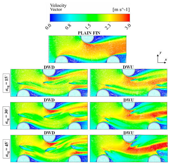 Velocity vectors at central plane z = 1.405 mm for air−to−water FTHEXs with plain fins and fins with DWD and DWU types of vortex generators. Test conditions: Tair,in = 22 °C, Twater,in = 40 °C, wair,in = 1.03 m/s, wwater,in = 0.76 m/s.