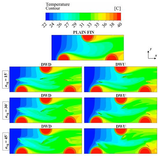 Temperature distributions at central plane z = 1.405 mm for air−to−water FTHEXs with plain fins and fins with DWD and DWU types of vortex generators. Test conditions: Tair,in = 22 °C, Twater,in = 40 °C, wair,in = 1.03 m/s, wwater,in = 0.76 m/s.