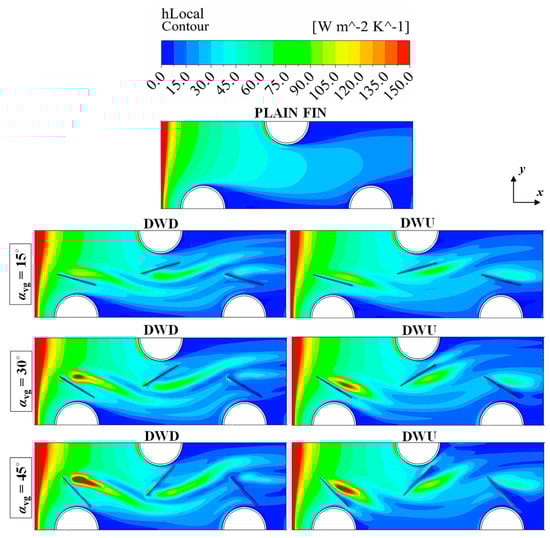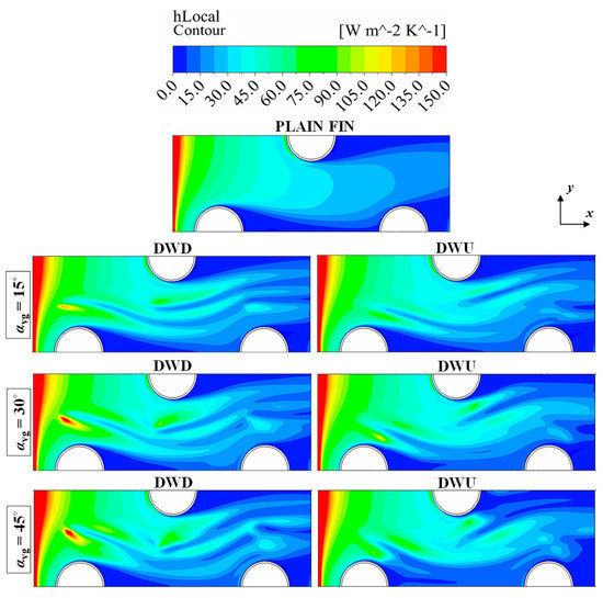 In order to examine the air-side heat transfer behaviour along the airflow direction, the local distributions of the air-side heat transfer coefficient (HTC) on the fin surfaces with and without VGs for wair,in = 1.03 m/s (ReDh = 400) are shown in Figure 15 and Figure 16. The surface with the VGs is the lower fin surface and the surface without VGs is the adjacent upper fin surface. The local regions of high heat transfer associated with the (I) horseshoe vortices formed at the tube surface, (II) the longitudinal main and corner vortices formed in the presence of delta-winglets and (III) guidance of the airflow in the wake zones visible on the air-side HTC contours. It is evident that the maximum values of the air-side HTC on both fin surfaces occur at the entrance of FTHEX and then gradually decrease toward the airflow direction due to the development of the thermal boundary layer. The longitudinal vortices generated by the fins with delta-winglets drastically improve the heat transfer in different local regions. The zones of low heat transfer behind the tubes are narrowed due to the reduction in recirculated wakes. A larger attack angle of delta-winglets diverts more air particles toward the wake zones, resulting in smaller recirculation patches. The formation of the vortex structure also reveals higher HTC zones near the upper lateral edges of the winglets on the surface with VGs and in the zones of the leading (DWD configuration) or trailing (DWU configuration) edges of the winglets on the surface without VGs. These zones intensify at larger attack angles, due to the more intense secondary flow.