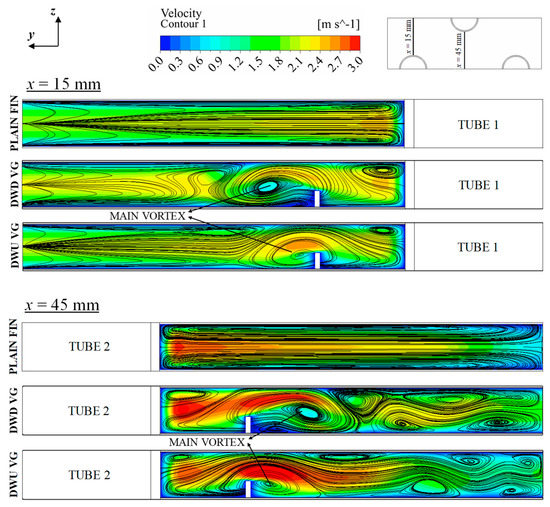 The HTC is more enhanced in the wake region of the fins with the DWU configuration of VGs, owing to the increased winglet area towards the rear of the tubes. However, for the cases with the DWD configuration the enhanced air-side HTC zones are spread out towards the outlet boundary and the HTC field is evenly distributed in the spanwise direction, which is due to better mixing and higher intensity of the vortex flow, as shown from the air streamlines in Figure 17. The longitudinal vortices interact with the boundary layer, creating a swirling flow that mixes the near-wall air with the free-stream air. From the above cross-sections, it can be seen that both delta-winglet configurations produce a rotating and secondary flow that leads to mixing of the air, disruption of the boundary layer, and thus better convective heat transfer between air and fin surfaces. The vortices with the largest extension are called the main vortices and they contribute most to the improvement of heat transfer along the flow channel. The intensity of the longitudinal vortices from the first row of VGs (x = 15 mm) is lower than that of the second row (x = 45 mm). From the overall observations of the flow patterns, it can be concluded that the transport of air is better for the DWD configuration.