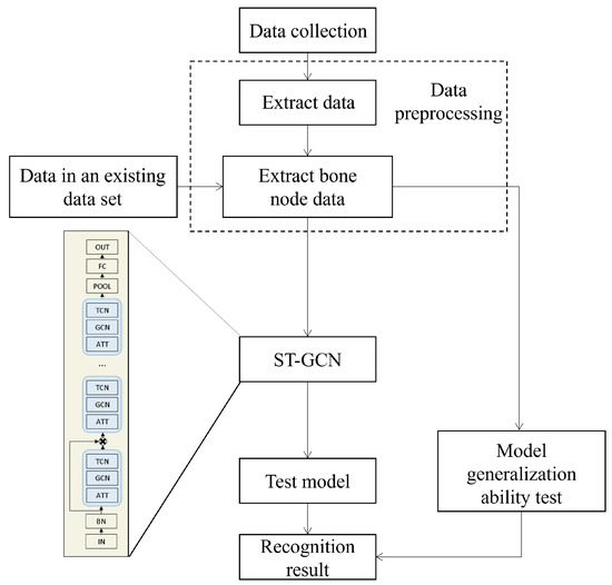 After the GCN was proposed, the graph attention network was designed according to the attention mechanism by superimposing the hidden self-attention layer, assigning different weights to different nodes in the neighborhood, and, finally, classifying nodes on the graph structure data is proposed in [23]. A GCN-based model for human action recognition was first proposed in 2018, called the ST-GCN (spatio-temporal graph convolutional network), in [24]. Subsequently, an Action-Structured GCN is proposed for human action recognition and prediction based on this model, which uses the attentional idea to design A-links to evaluate the importance of linkage between any nodes and uses S-link to obtain higher order dependencies of the graph and learns the spatio-temporal characteristics of the action by the combination of the two types of links. The GCN-based approach uses graph structure to model the skeleton and extracts features by convolutional operations on the graph to recognize and predict actions is proposed in [25].