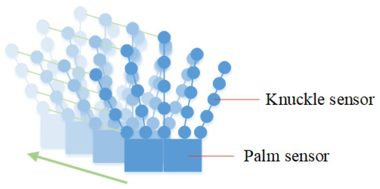 After determining to use the Vectorized Spatio-temporal Graph Convolutional deep learning model, the hand vector map needs to be constructed as the input to this learning model. The data obtained by the data glove are a series of data for a period of time, including the information of hand joint points at different time points. In order to extract the motion features of the whole hand movement, it is necessary to construct a hand structure vector diagram, which is an undirected graph, as shown in Figure 3. is composed of T frames with N joint points in each frame. In this vector diagram, all nodes from different frames form the set , in which t represents the serial numbers of all frames, and i represents the serial numbers of key points in a certain frame. Therefore, the feature vector of the i-th node in the t-th frame is the three-dimensional coordinate of the point. The eigenvectors of all nodes are used as the inputs of convolution neural network, and convolution calculation is carried out. Constructing the whole hand motion convolution graph can be divided into two steps. In the first step, in each frame sequence, all the hand joint points are connected in a natural connection mode to form a spatial map of the hand structure. Secondly, for different joint points of the hand, as shown in Figure 4, the same joint points in continuous frames are connected to form a time chart of the hand structure.
