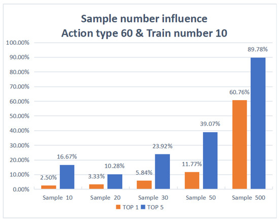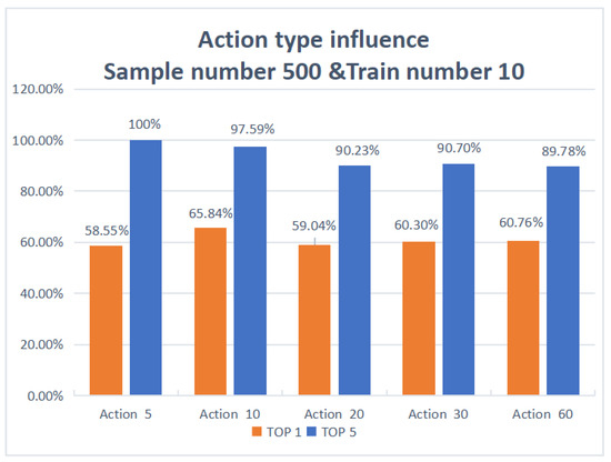The histogram of the effect of action type in Figure 8 shows that when the sample number is 500 and the train number is 10, the accuracy of action recognition increases with the increase in the action type. When the action type is 5, the degree of TOP1 accuracy is 58.55%, and the degree of TOP5 accuracy is 100%; when the action type is 10, the degree of TOP1 accuracy is 65.84%, and the degree of TOP5 accuracy is 97.59%; when the action type is 20, the degree of TOP1 accuracy is 59.04%, and the degree of TOP5 accuracy is 90.23%; when the action type is 40, the degree of TOP1 accuracy is 60.30% and the degree of TOP5 accuracy is 90.70%; when the action type is 60, the degree of TOP1 accuracy is 60.76% and the degree of TOP5 accuracy is 89.78%. It can be seen that the degree of TOP1 accuracy increases when the action type keeps increasing, but the increase is not significant, and it can be determined that the action type is not the key factor affecting the maximized accuracy.