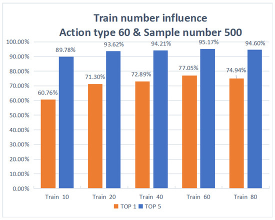 The histogram of the impact of train number in Figure 9 shows that when the sample number is 500 and the action type is 60, the accuracy of action recognition increases with the increase in the train number. When the train number is 10, the degree of TOP1 accuracy is 60.76% and the degree of TOP5 accuracy is 89.78%; when the train number is 20, the degree of TOP1 accuracy is 71.30%, and the degree of TOP5 accuracy is 93.62%; when the train number is 40, the degree of TOP1 accuracy is 72.89%, and the degree of TOP5 accuracy is 94.21%; when the train number is 60, the degree of TOP1 accuracy is 77.05%, and the degree of TOP5 accuracy is 95.17%; when the train number is 80, the degree of TOP1 accuracy is 74.94%, and the degree of TOP5 accuracy is 94.60%. It can be seen that the degree of TOP1 accuracy increases as the train number increases, but the increase is not significant, and it can be determined that the train number is not a key factor affecting the maximization of accuracy.