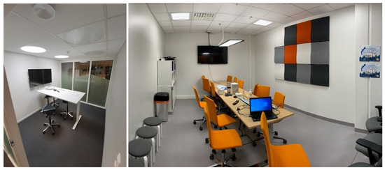 The source room is located in an office building (shown on the left in Figure 1). The source room is a typical small meeting room with seats for four persons and with an approximate size of 6 m2. It is located in the middle of the floor and surrounded by an open office area. The ventilation system has constant airflow of 15 L/s consisting of 100% fresh outdoor air. The indoor climate IoT sensor was placed on the desk in the room. The camera for collecting ground truth occupancy was installed on the ceiling, just above the door. The ground truth for the source model was acquired using a video camera recording (the image was blurred for privacy purposes), which was used for manual counting of the number of people in the source room for the period 13 February–9 March 2020.