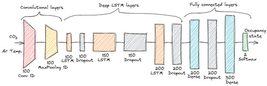 Normalized and preprocessed data were then ready to be used with the CDLSTM model. The model was created using the deep learning Python package Tensorflow/Keras [47] and was designed as follows and as presented in Figure 2. Room air temperature and CO2 data enter the convolutional layer which was created with 100 output filters, a kernel size of three which specifies the 1D convolutional window and a pooling size of two, with ReLU activation function. Following is the deep LSTM model, consisting of three LSTM layers, with hidden layer sizes of 100, 150 and 200, respectively. After each layer there is a dropout layer served for regularization with masking probability of 0.5. Following the LSTM layers, there are two fully connected dense layers with hidden size 200 and 300. Another dropout layer is placed between the fully connected layers with a probability of 0.3. At the end, there is a softmax layer classifying the model outputs to classes, in our case occupancy states. The loss function used for the training of the CDLSTM model was cross-entropy, binary for occupancy detection and categorical for occupancy level prediction.