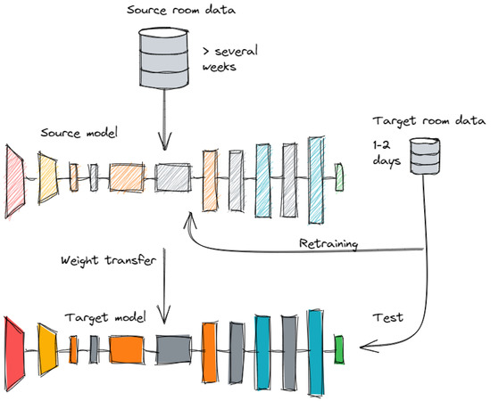 In this section, the transfer of the source model to be used for occupancy detection with the data of a target room in a different building is assessed. The transfer learning of the source model for successful occupancy detection is analysed from the point of the CDLSTM specific process for retraining and minimum training data needed from the target room.